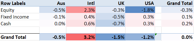 For a while I have been slightly overweight International (non UK/USA/Oz) equities. Right now, this is probably a useful tactical overweight.