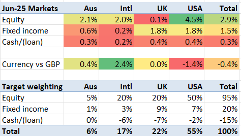The markets had quite a good June – especially in the USA where the equity markets have shaken off their Tariffs Tantrum, and even bonds rose appreciably. World equities have still not quite recovered to January levels, but that’s being pedantic. The markets I’m exposed to rose a weighted average 3.1%.