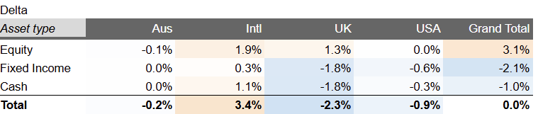 I remain leery of US equities , but thanks to the slight reduction in my target exposure last month, I am now on my target exposure. I am underweight fixed income, and sense I will be for some time if equities remain so bouyant. And I’m a bit overweight UK and International Equities – something that I am likely to get more proactive with.