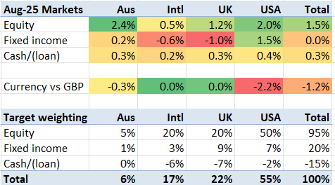 August saw the recent trends continue, with equities continuing to progress – particularly in the USA where this was accompanied by a drop in the USD. Trump’s attack on the Fed haven’t been helping the bond markets though you have to say the narrative about his tariffs creating a material revenue line to help stabilise the US narrative does seem to be winning versus the ‘the US economy is going to go down the plughole’ narrative we were hearing six months ago.