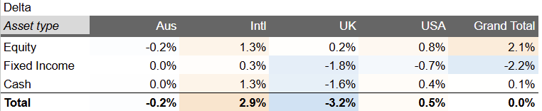 These steady rises in equities are putting me in the familiar position of being perennially underweight on fixed income. My deltas to my target allocation are all manageable, with the largest being an almost 2% underweight position on UK Fixed Income, and a slight overweight in International Equities.