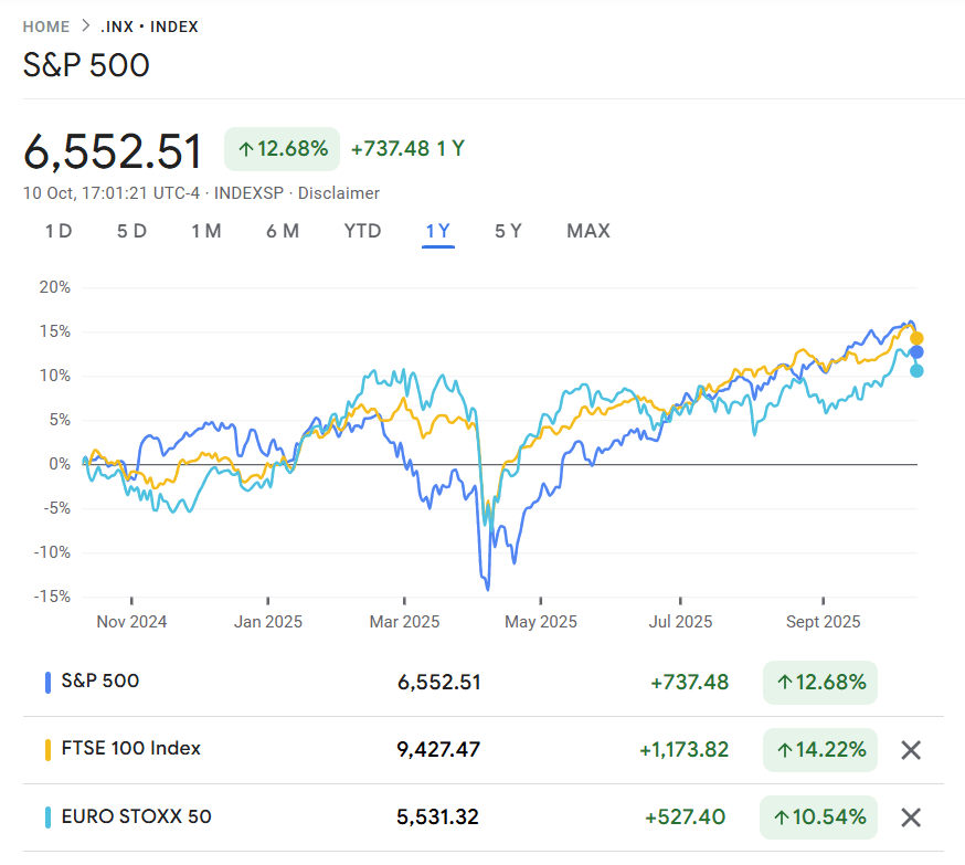 Meanwhile, the market continues to climb. The S&P is up about 10% on a 1 year basis, but up 30% from its Trump Tariffs low. But in fact it is the UK’s very own FTSE-100 which has had the best 12 month run versus the rest of Europe/USA.